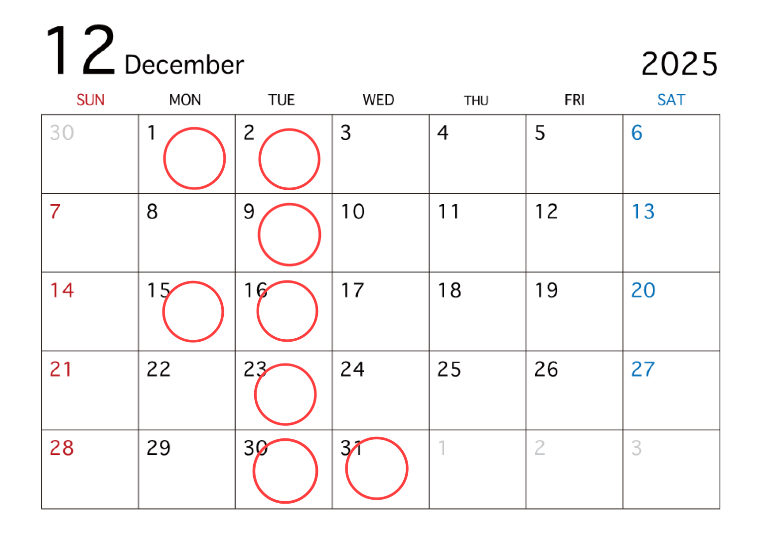 毎週火曜日と1(月)、15(月)、31(月)となります。