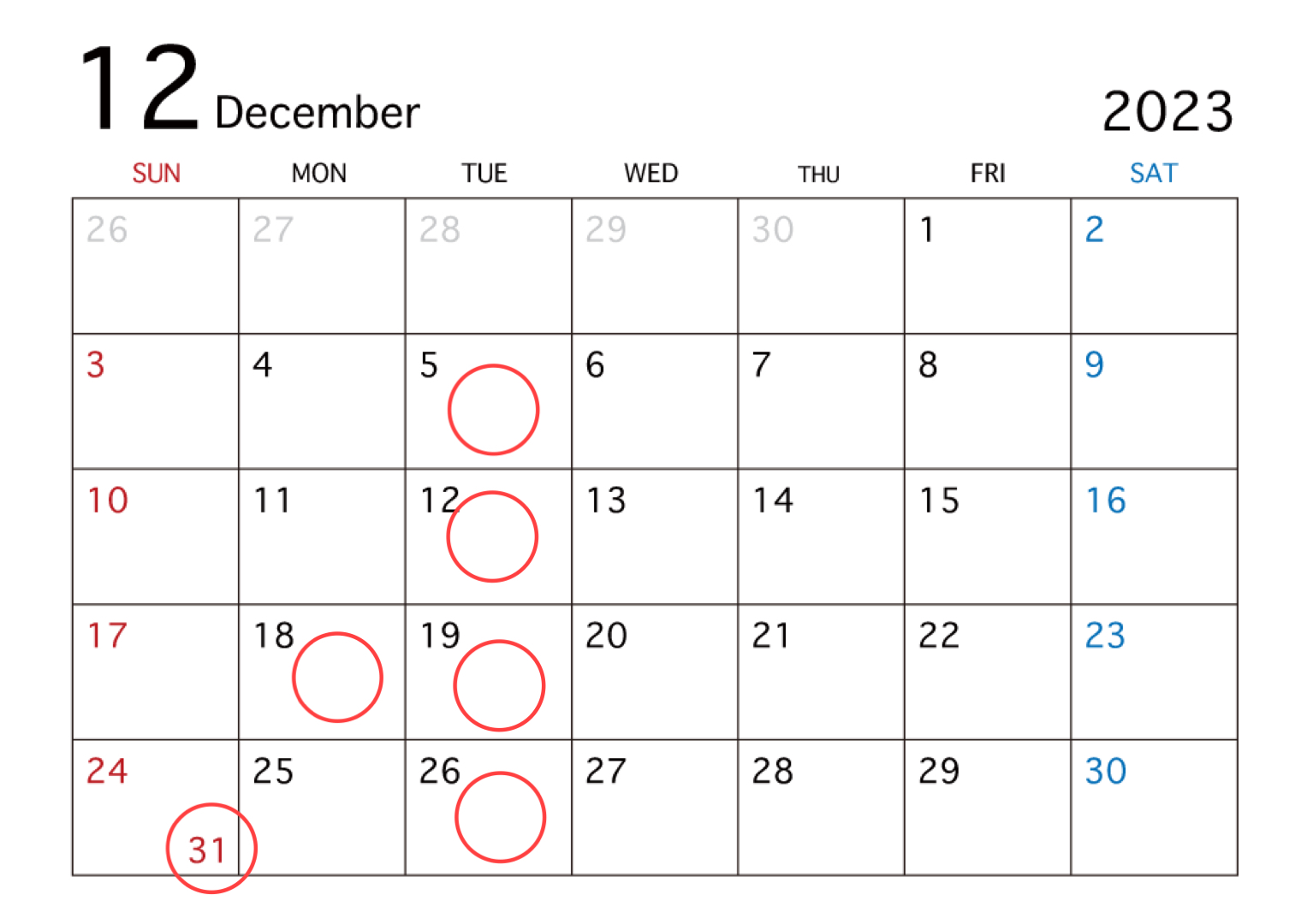 12月のお休みは毎週火曜日と18日(第三月曜日)、31日(大晦日)となっております。