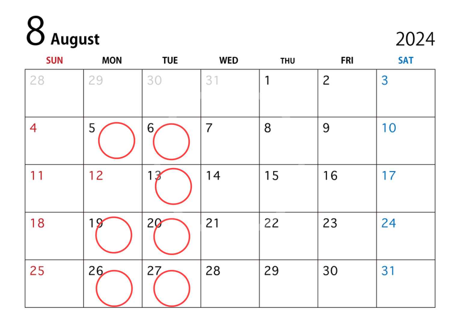 8/5(月),8/6(火),8/13(火),8/19(月),8/20(火),8/26(月),8/27(火)